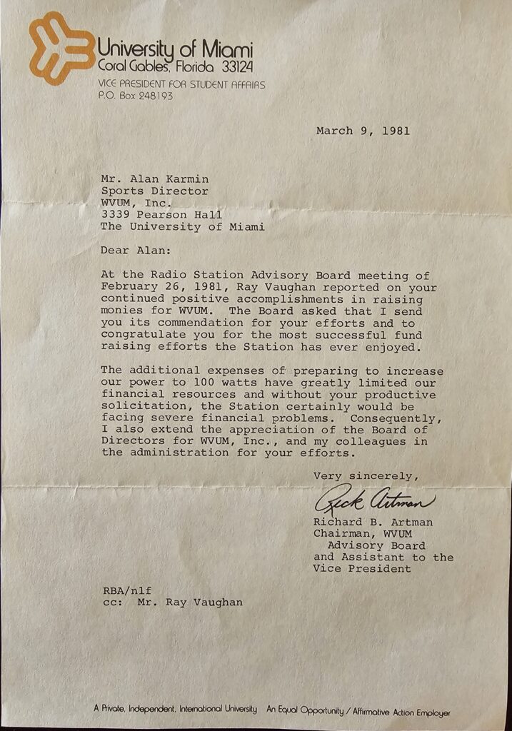 In 1981, the FCC required all 10-watt stations to increase to at least 100 watts. WVUM, through the fundraising efforts of the student executive board, raised the monies needed to acquire the equipment needed to satisfy the FCC mandate, and increased to 365 watts by 1982 under the guidance and leadership of GM Ray Vaughan.
