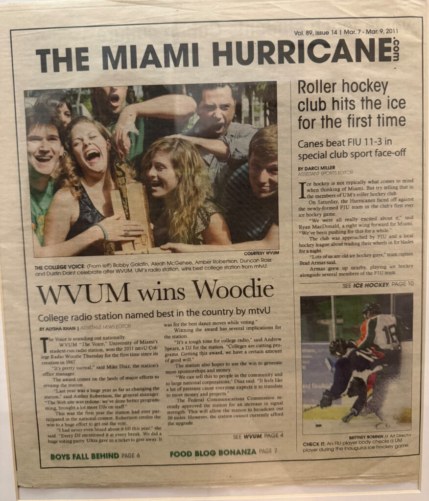 In 2011, under the leadership of GM Amber Robertson, WVUM was awarded mtvU’ Woodie Award “Best College Radio Station.”